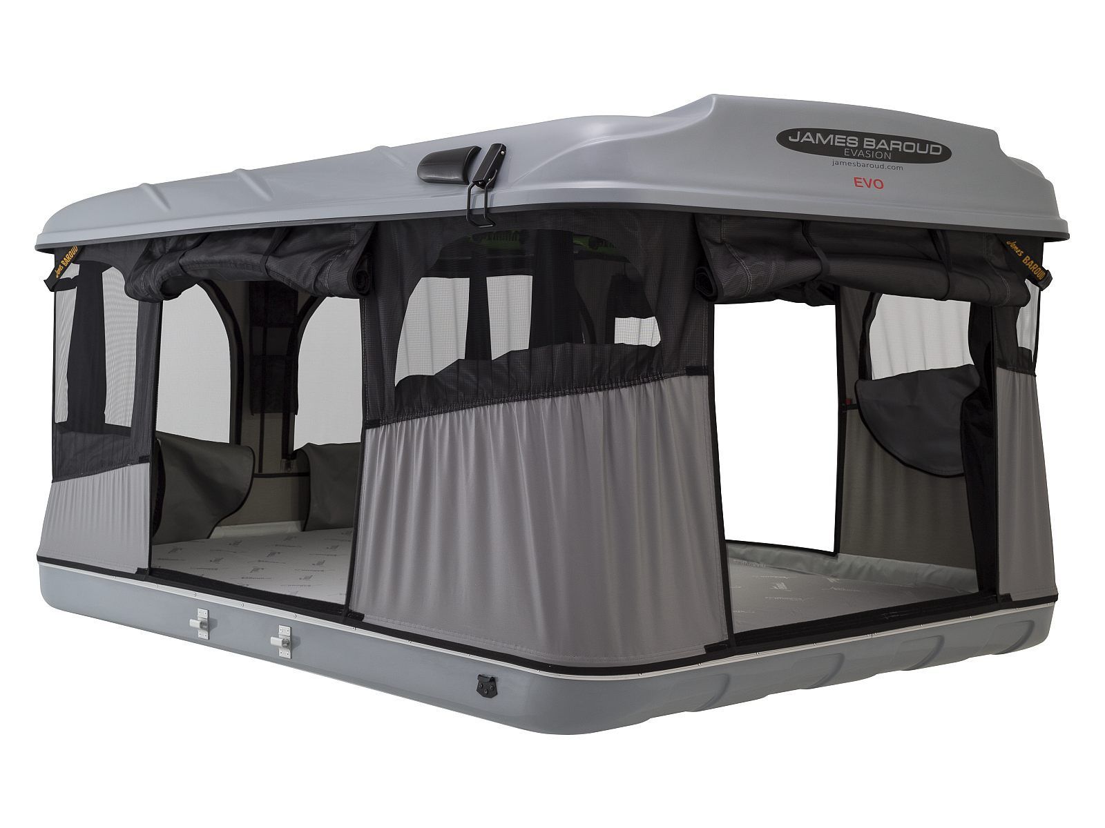 - L’ouverture de la tente se fait automatiquement en moins de 15 secondes au moyen de deux vérins, actionnant des bras articulés protégés par une housse en toile.