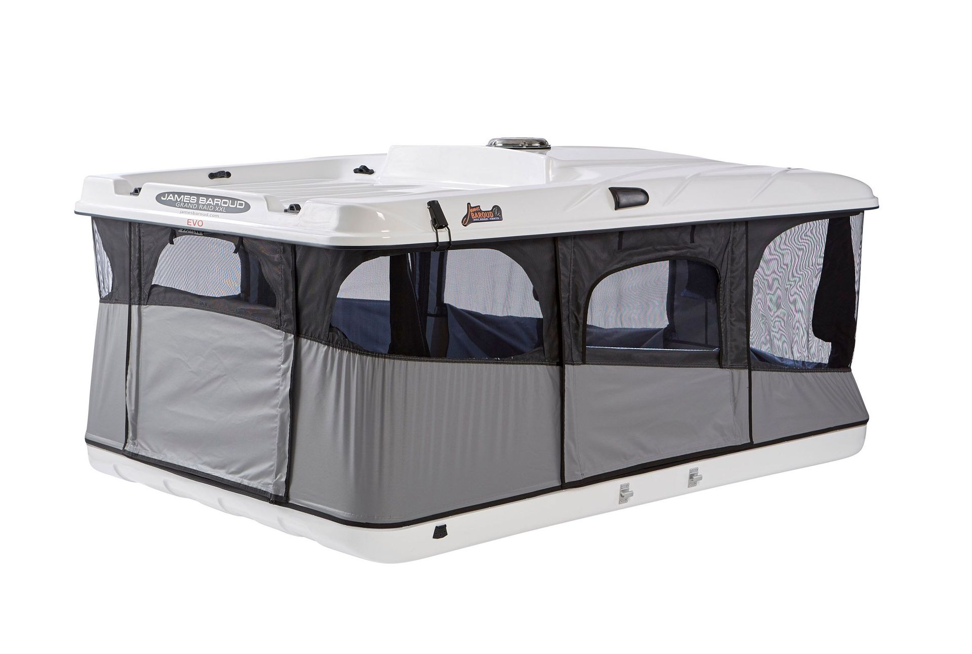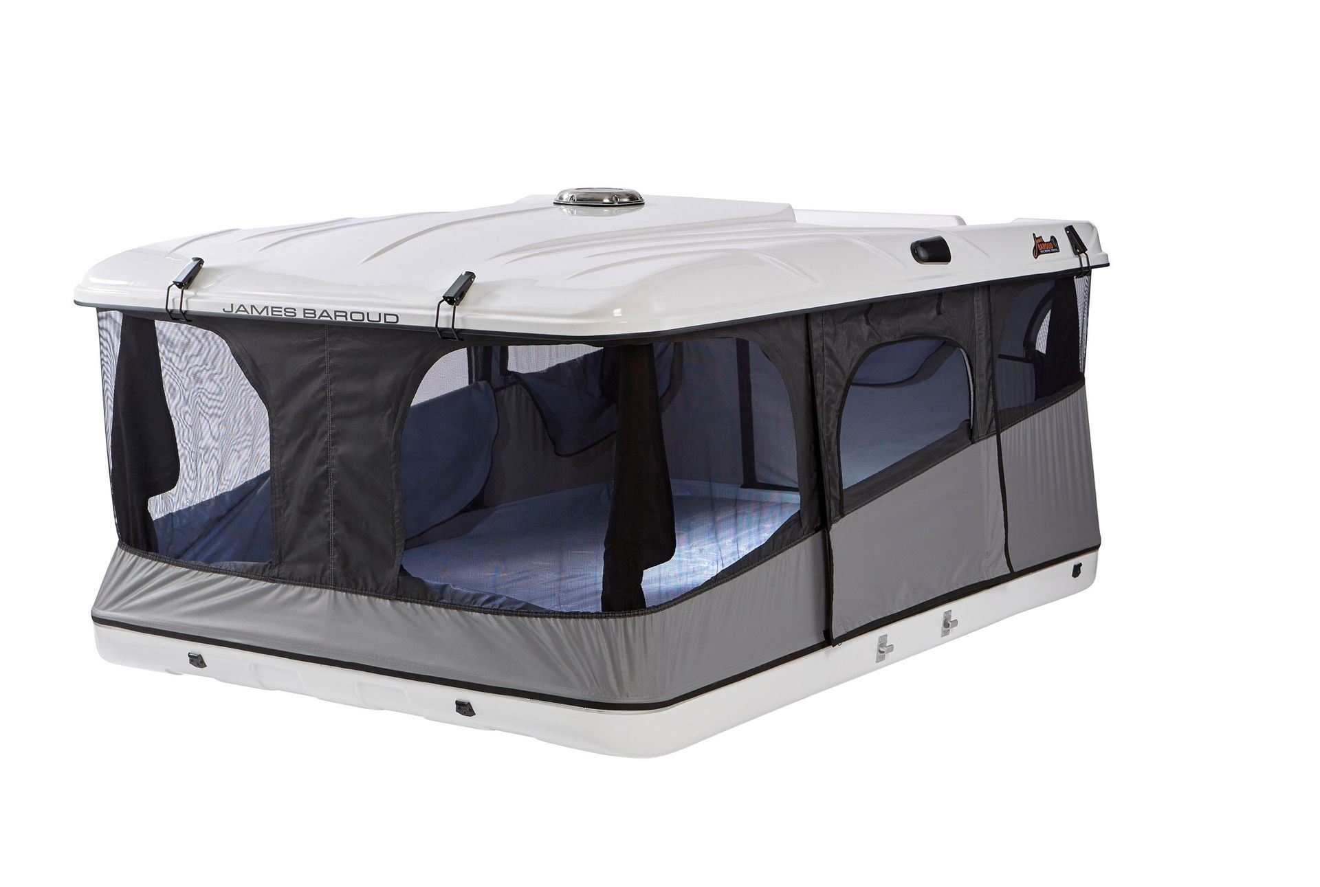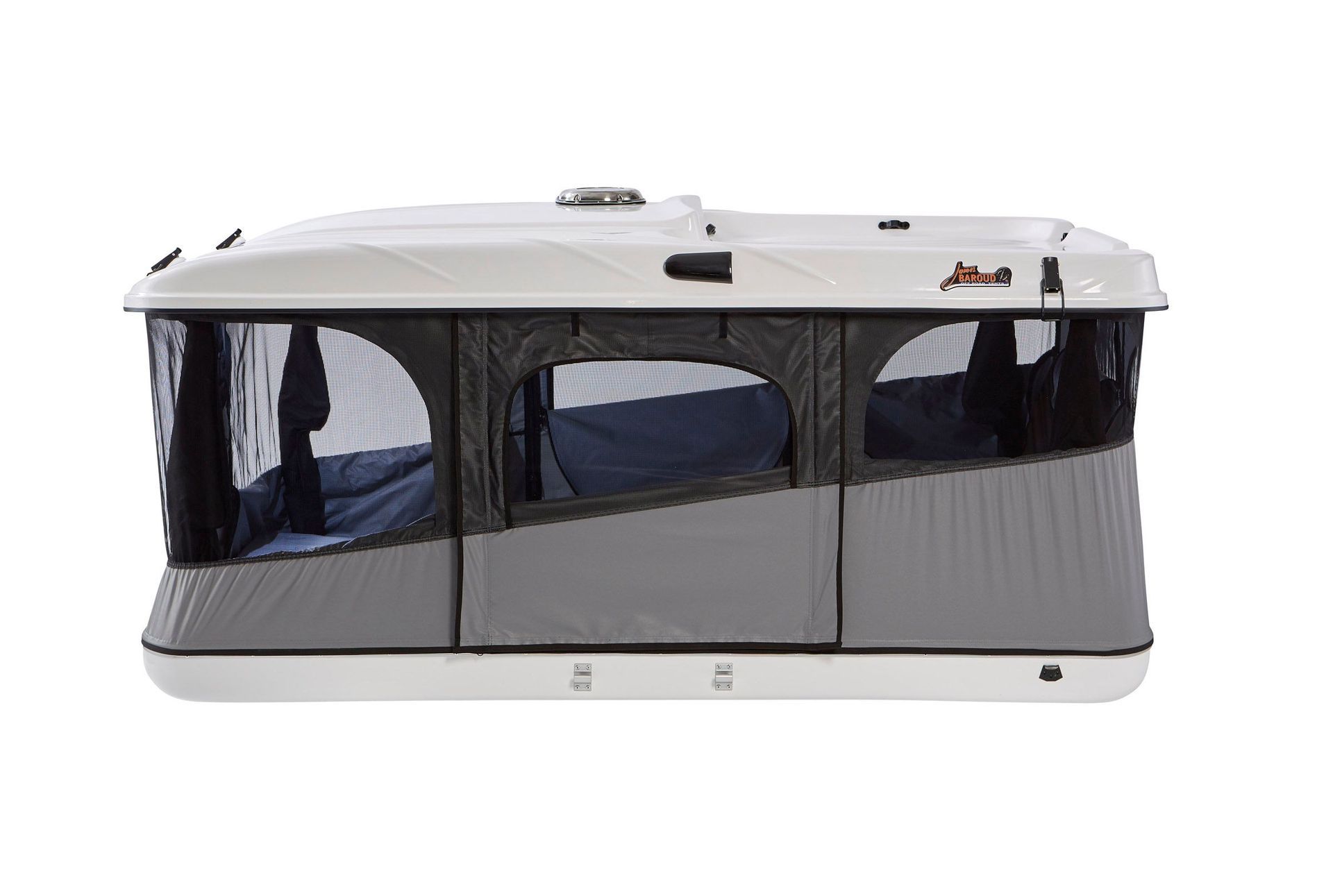 - L’ouverture de la tente se fait automatiquement en moins de 15 secondes au moyen de deux vérins, actionnant des bras articulés protégés par une housse en toile.